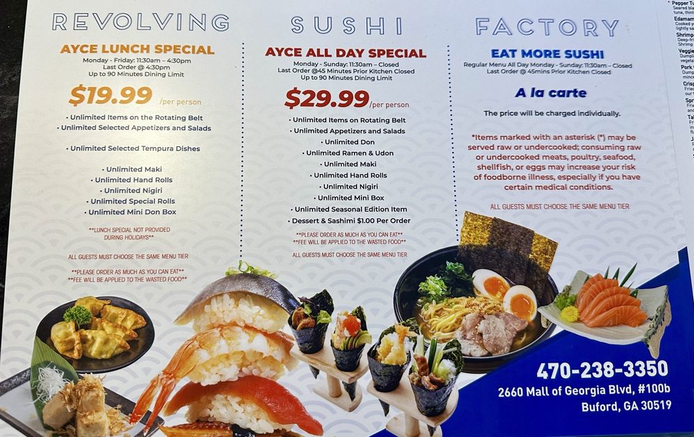 Welcome to Revolving Sushi Factory, a delightful sushi experience located in Buford, GA. This innovative dining spot captivates patrons with its unique revolving conveyor belt, making sushi selection fun and interactive. Guests can choose between an all-you-can-eat (AYCE) experience or a la carte options, perfect for satisfying any sushi craving.